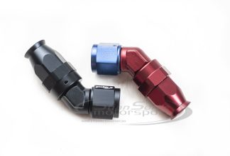 90° AN koblinger til Teflon- (PTFE) slanger. Disse må ikke forveksles med vanlige Slange-Ender, da disse har en klemring laget til teflonet i slangene. Passer til både stålomspunnet- og nylonomspunnet-teflonslange. AN-koblingene holder den absolutt høyeste kvaliteten som finnes på markedet i dag. Teflon er mer brukt i oppsett med etanol/metanol, da det ikke er noe gummi som tørker ut.